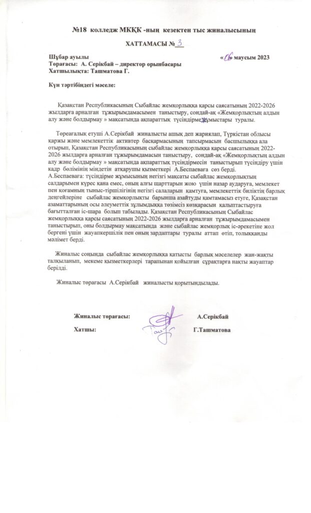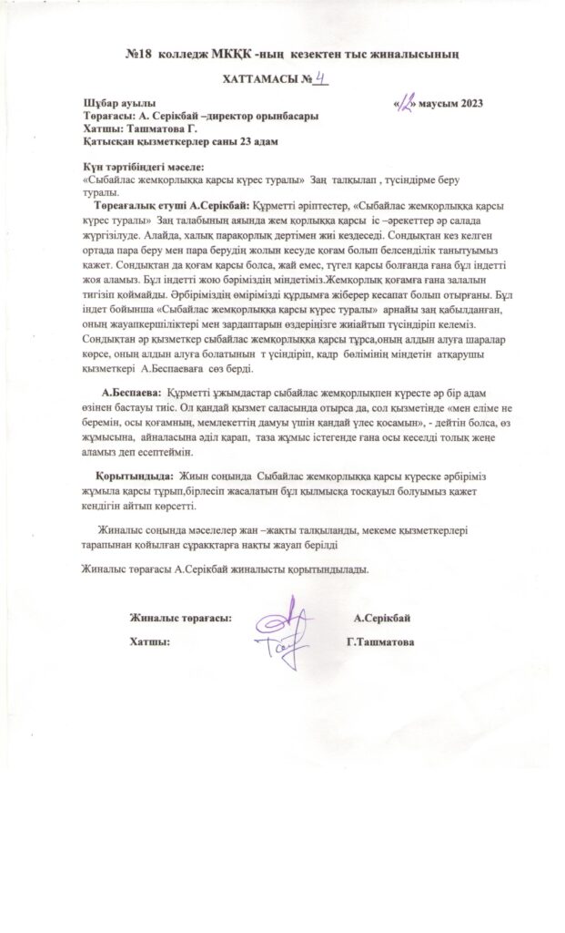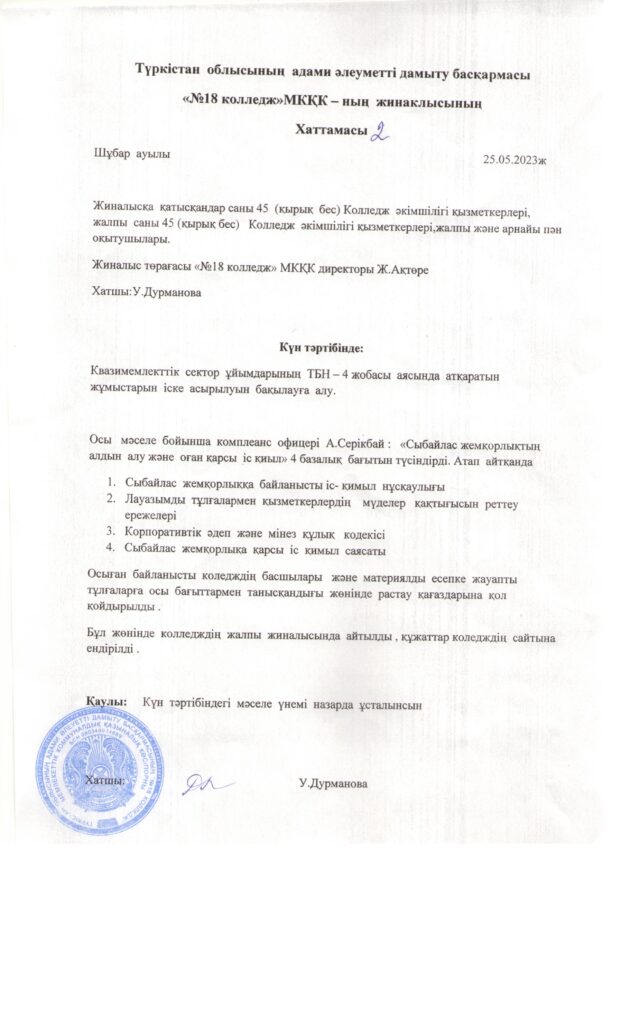 №18 колледж жиналысының хаттамалары. 1-хаттамаСкачать №18-колледж-комплаенс-қызметтердің-фукционалдық-міндеттерін-жүктеу-бұйрығыСкачать