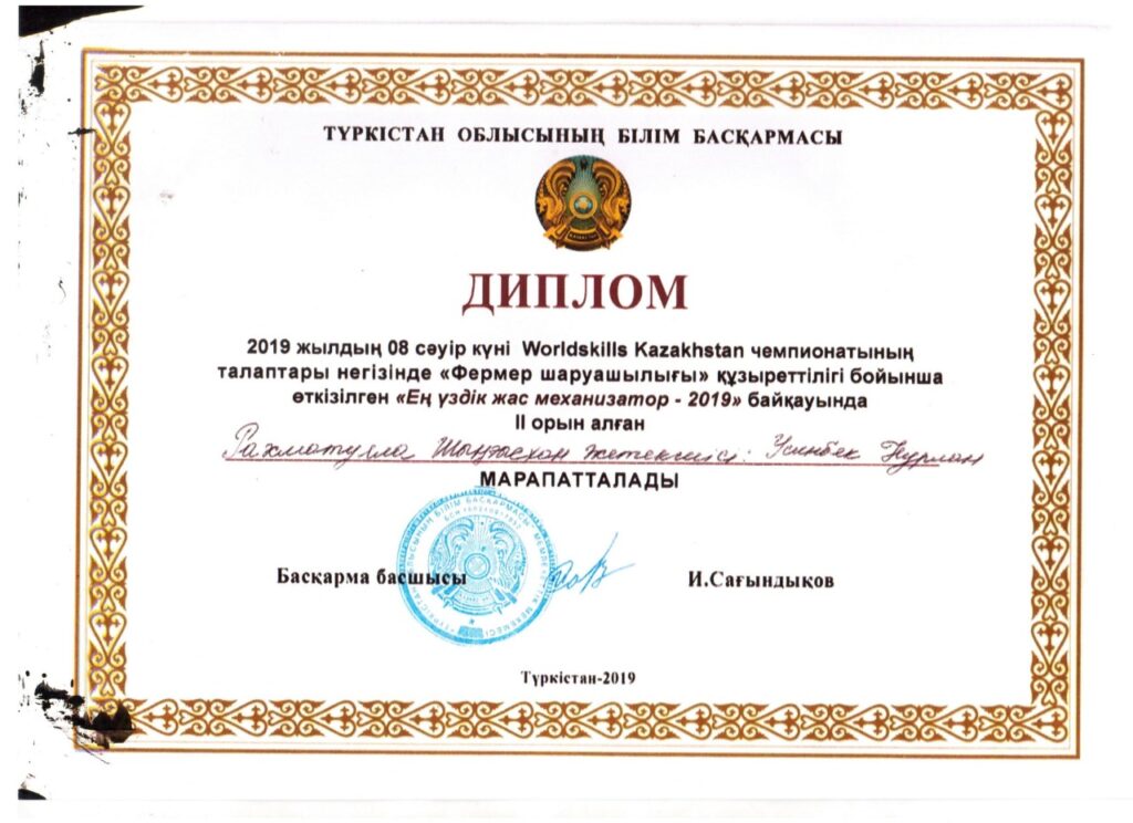 Жарыс қорытындысы бойынша Фермер шаруашылығы Рахматулла Шыңғысхан Тулеков Тогысбек Түркістан облысының білім басқарма басшысының ІІ дәрежелі дипломымен марапатталды.
